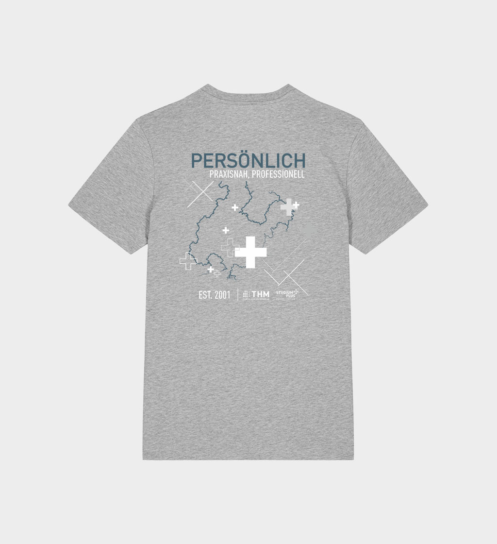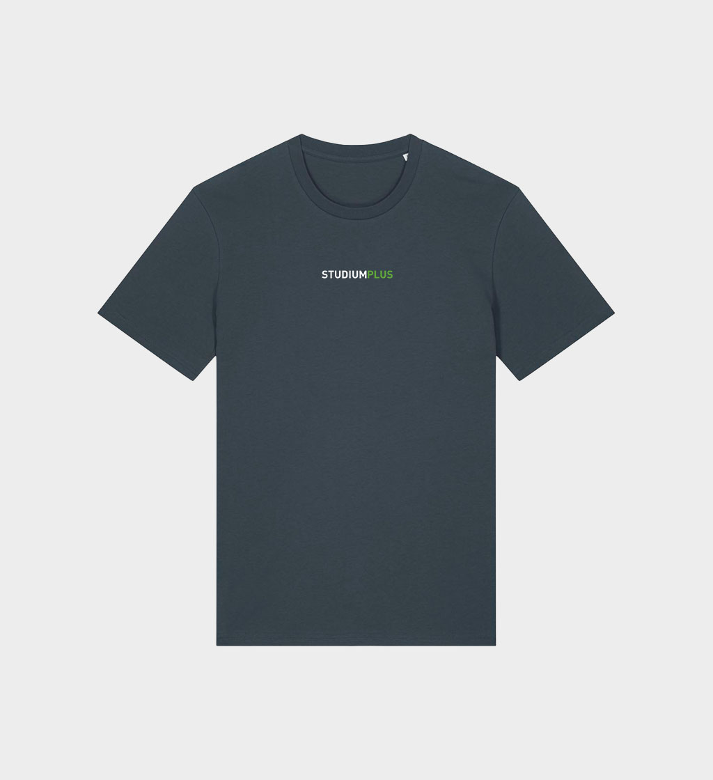 Modernes, nachhaltiges, zweifach bedrucktes T-Shirt in Heather Grey und India Ink Grey mit Design im Business-Look zum 25-jährigen Jubiläum von StudiumPlus – ideal für Alltag und professionelle Anlässe. Hochwertiger Druck, angenehmer Tragekomfort, limitierte Auflage – exklusiv hier.